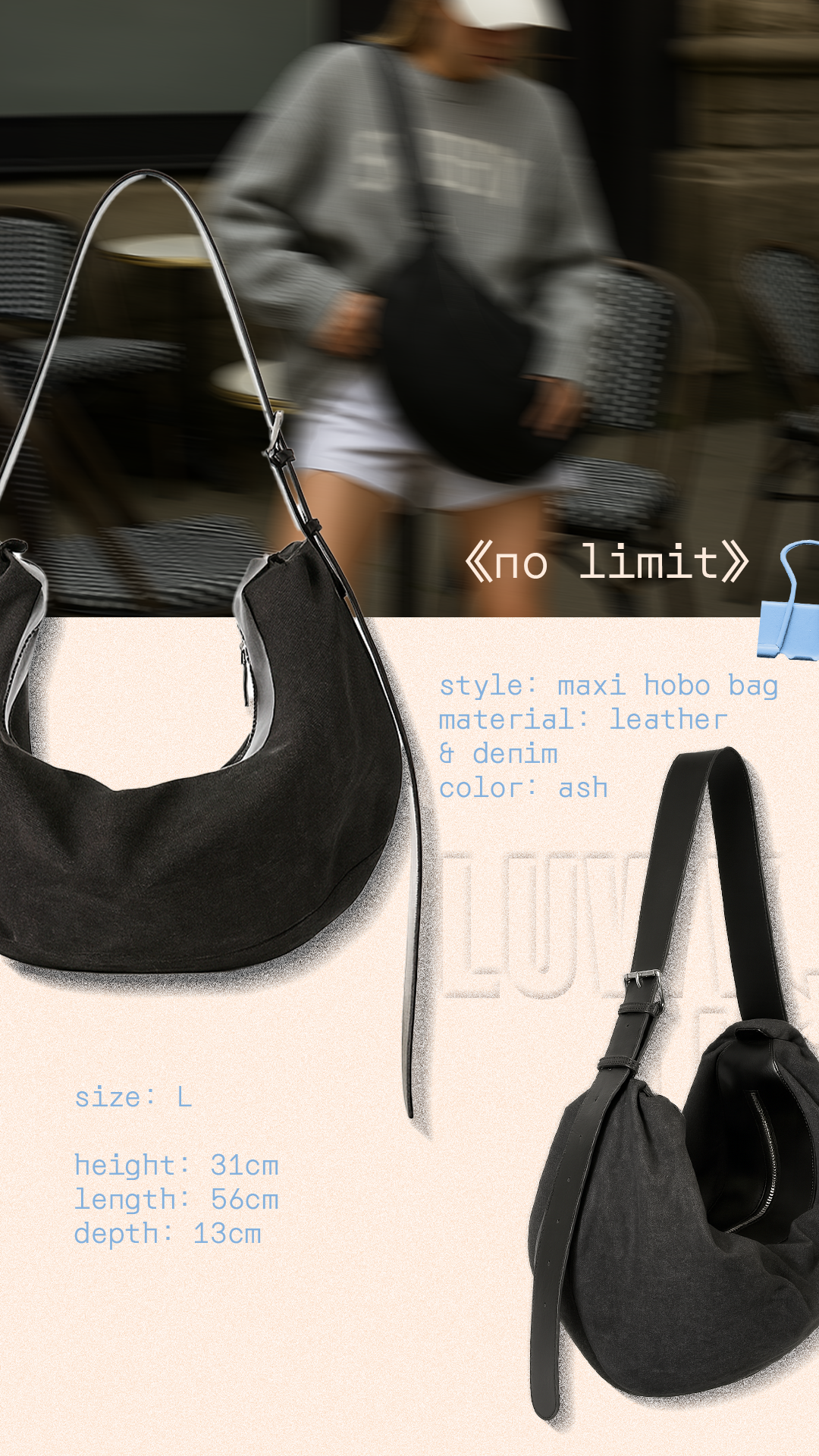 Na trénink. Na letiště. Na všechno mezi tím. Lehká, poddajná, ale vždy připravená. Kombinuje pohodlí denimu s elegancí kůže.Taška, která se přizpůsobí tobě – a tvému tempu.stýl: maxi hobo bagmateriál:denim a kůžebarva: ashvelikost: Lvýška: 31cm délka: 56cmhloubka: 13 cm
